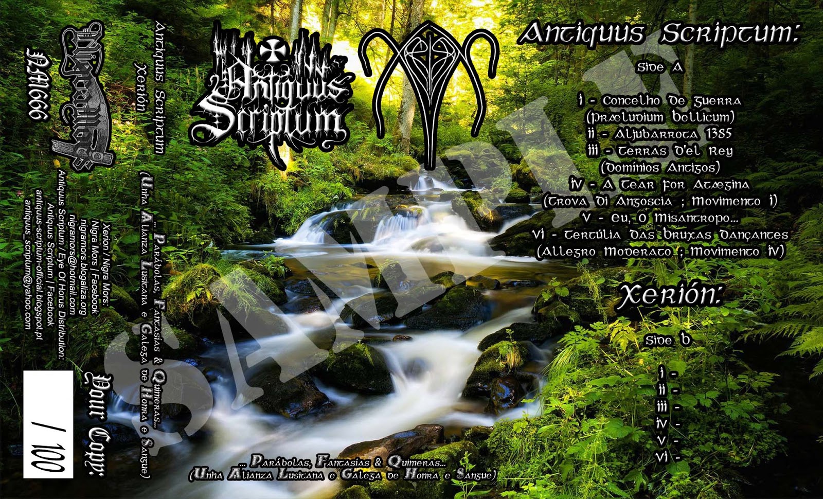 Saudações dos Domínios Antigos! A Dupla Tape da compilação, "... Outrora, Quando As Águas Choravam..." (Parte I & II), de Antiquus Scriptum, está finalmente cá fora através da lusitana Satanhades Productions, ou não fosse este selo nacional datado de meados dos gloriosos annos 90 e gerido pelos 2 Guardiões do Graal, Paulo Mira & Carlos Fernandes (ex-Celtic Dance), Arkenstone, que andam nisto há mais de 20 Invernos, sempre com um empenho e uma dedicação indubitáveis! Bebi umas fresquinhas com eles no Cais Sodré, ontem, e além de rever e pôr a conversa em dia com estes 2 velhos guerreiros do Black Metal nacional, ainda pude trazer esta obra de arte, editada por eles, em 2 cassetes lindíssimas, como podem ver, que são limitadas a 100 cópias (de cada). As Tapes são ultra-profissionais, timbradas, com fita Chrome Dioxide II, impressas na Edisco, no Porto, e custam 10€ as 2 (5€ cada) + portes. ***!!Este artigo só é vendido em conjunto!!***